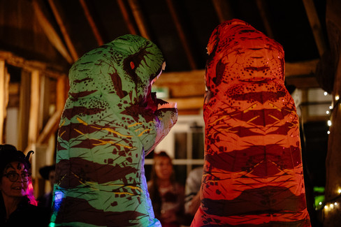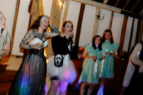 The rest of the evening was exactly what you’d hope for. Skeleton cake toppers, a live band, guests roaming between rooms in full Halloween outfits…from subtle skeletons to full-on inflatable dinosaurs. The couple shared their first dance while Lisa’s eldest daughter signed the lyrics for guests, a simple but incredibly powerful moment that made it even more emotional.
