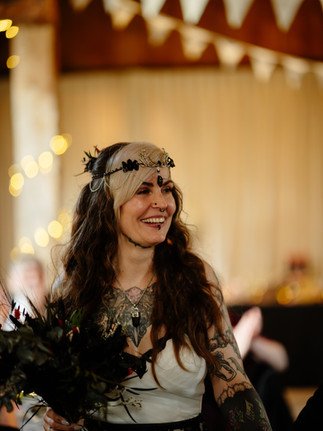 Chris, Lisa and their guests enjoyed their canapes, drinks and the staff at the Clock Barn were flipping the room ready for food. In true Alternative wedding style, the tables were decked in skulls, black lace, challices and gothic dressings. It was amazing. Speeches that pulled even the most emo, black heartstrings from Chris' best man and Lisa's daughter. Dotted around the room were 2 interpreters making the speeches accessible for all.