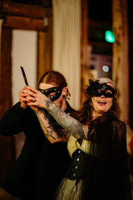 We disappeared with Lisa & Chris and a handful of friends to get changed. Our costumes leaned more towards face paint than actual outfits. Liv frantically turned me into a skeleton while transforming herself into a bat, all while we somehow still managed to document Lisa & Chris masking up too.